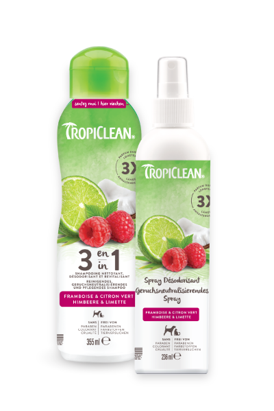 Le shampooing 3 en 1 TropiClean Framboise et Citron vert nettoie, désodorise et revitalise le pelage. Grâce à sa technologie innovante longue durée, il pénètre en profondeur, garantissant une fraîcheur durable et éliminant les mauvaises odeurs. Sa formule à la glycérine crée une couche protectrice qui hydrate le pelage en continu. Élaboré sans savon et composé à 94 % d’ingrédients d’origine naturelle, il laisse un parfum agréable et durable de framboise et de citron vert. Pour prolonger la fraîcheur entre deux shampooings, il peut être utilisé avec le désodorisant 3 en 1 TropiClean à la framboise et au citron vert.