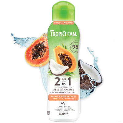 Le shampooing et après-shampooing TropiClean à la papaye et à la noix de coco nettoie, hydrate et revitalise la peau et le pelage de l’animal grâce à une mousse généreuse qui facilite le démêlage et le brossage, laissant le pelage doux et sain. L’extrait de papaye et de noix de coco procure un parfum frais et agréable. Sa formule sans savon, composée à 95 % d’ingrédients d’origine naturelle, convient aux chiens et aux chats dès 12 semaines.
