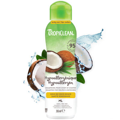 Ce shampooing convient aux chiens et aux chats à partir de 12 semaines. Il est sans savon, sans parabènes, sans colorants et sans alcool, et contient 94 % d’ingrédients d’origine naturelle. Les acides alpha-hydroxylés (AHA) réduisent les pellicules grâce à une exfoliation douce et hydratent la peau. La noix de coco et la vitamine E préviennent la chute des poils et renforcent le pelage. Les oméga-3 et oméga-6 nourrissent et renforcent l’épiderme et le pelage, tandis que l’aloe vera et les extraits botaniques assurent un pelage lisse. Sa formule au pH optimisé n’affecte pas l’efficacité des produits anti-puces et anti-tiques. Tous les produits TropiClean sont non testés sur les animaux.