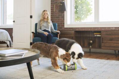 Le distributeur mobile de croquettes Kibble Chase™ de PetSafe® est un jouet interactif conçu pour divertir les chiens. Il suffit de le remplir de croquettes et de l’allumer pour que le jouet roule de manière aléatoire sur le sol tout en distribuant les croquettes. Idéal pour les chiens qui mangent trop vite, il permet de nourrir un chien glouton progressivement. Le jouet peut contenir jusqu’à 118 ml de croquettes et ses roues en caoutchouc résistant sont adaptées à la plupart des surfaces d’intérieur. L’ouverture réglable permet de contrôler le débit de distribution.